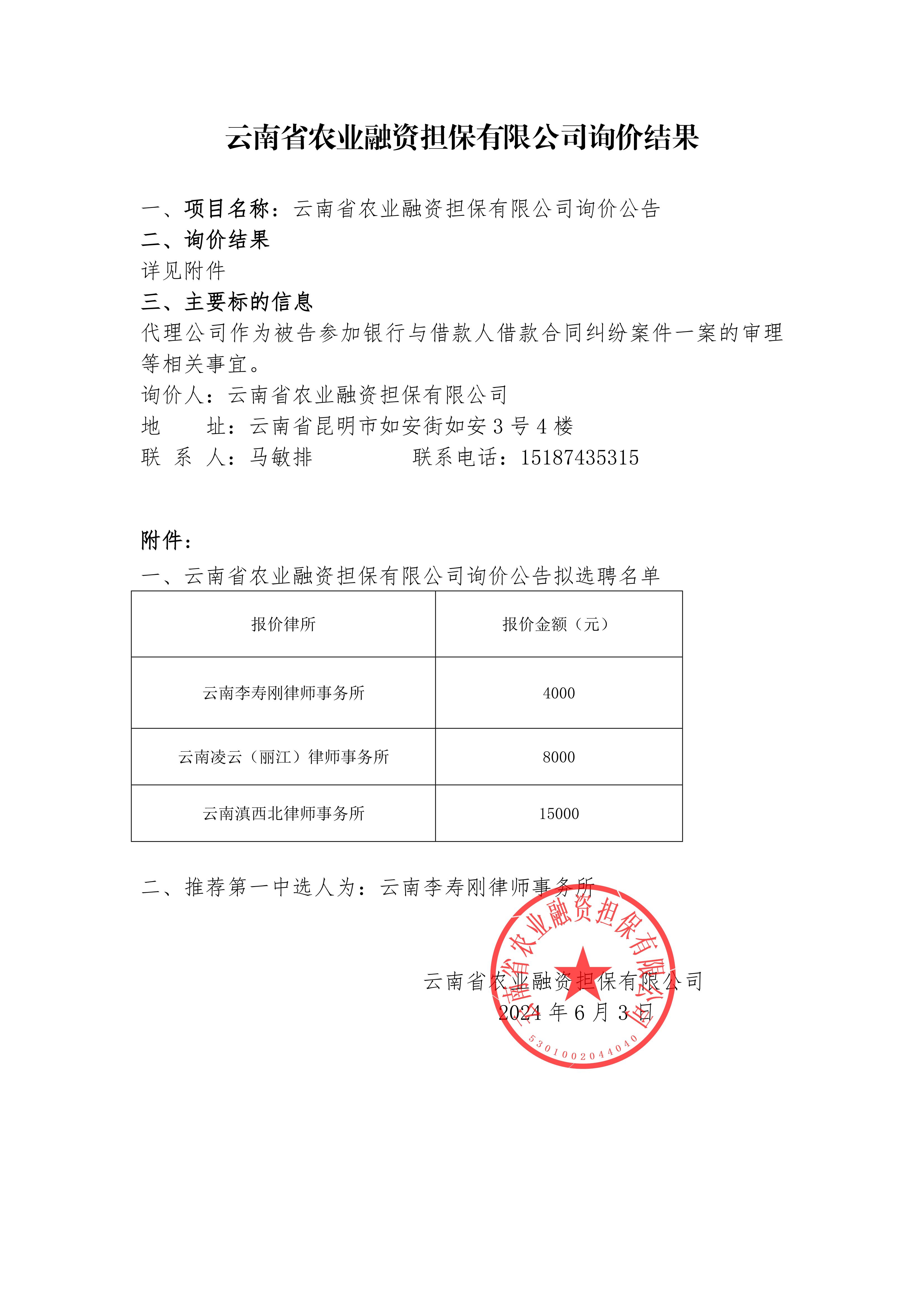 云南省農(nóng)業(yè)融資擔保有限公司詢價結(jié)果