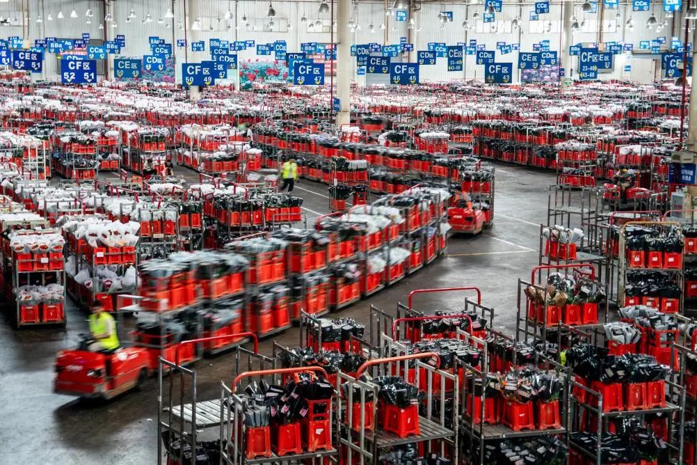 臺車在昆明國際花卉拍賣交易中心內轉運鮮花(7月9日攝)。新華社記者 胡超 攝