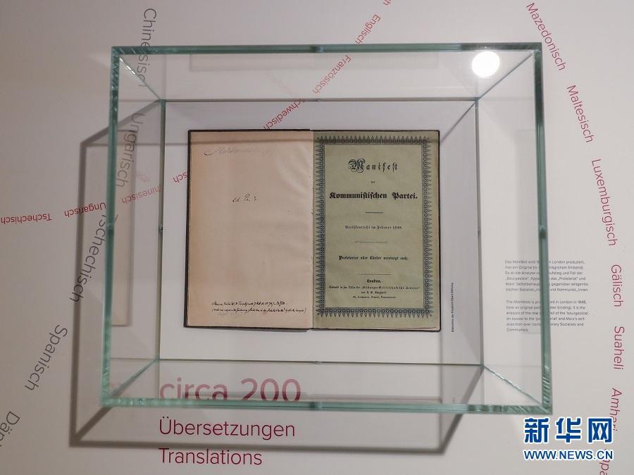 歷史長河奔流不息,真理之光穿越時空。1818年5月5日,德國小城特里爾,一代偉人馬克思誕生。200年后,世界東方。高擎馬克思主義的精神火炬,在習近平新時代中國特色社會主義思想指引下,中國共產(chǎn)黨正領(lǐng)導(dǎo)億萬人民書寫人類發(fā)展史上新的奇跡。這是2018年5月3日在德國特里爾馬克思故居紀念館內(nèi)拍攝的1848年出版的《共產(chǎn)黨宣言》第一版。