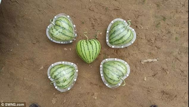 其實,形狀各異的西瓜是靠模具壓制而成的。當西瓜生長至幼瓜階段時,將它們放置在方形、元寶形和心形的塑料模具中,生長期間,西瓜會一直受到模具擠壓,在撤離模具后,就成了各式的形狀。