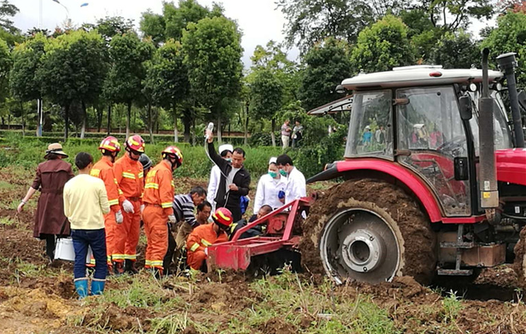 本次演練采取實戰(zhàn)演練。模擬了拖拉機駕駛員在進行旋耕作業(yè)時雜草纏繞機具,在未熄火停機情況下下車檢查而造成刀片傷人事故及另一名拖拉機駕駛員因圍觀事故現(xiàn)場分神造成拖拉機側翻點燃秸稈引發(fā)火災的次生事故。演練由農(nóng)業(yè)、公安、消防、急救等多部門協(xié)同配合,對農(nóng)機事故報案、接報農(nóng)機事故啟動應急響應、農(nóng)機事故現(xiàn)場救援、事故現(xiàn)場突發(fā)情況處理、農(nóng)機事故現(xiàn)場勘查、調(diào)查認定責任、賠償調(diào)解等科目進行演練,著力檢驗我省農(nóng)業(yè)主管部門及其農(nóng)機安全監(jiān)理機構對農(nóng)機事故的應急響應能力,各相關部門聯(lián)合開展農(nóng)機事故應急處理救援的協(xié)作配合水平,農(nóng)機安全監(jiān)理人員處理農(nóng)機事故的實際能力水平,以及各級農(nóng)機事故應急處理預案的科學性、操作性,查找農(nóng)機事故應急處理救援存在的問題和不足,推進建立統(tǒng)一領導、分級負責、反應及時、規(guī)范有序、協(xié)作聯(lián)動、科學高效的應急體系,全面加強農(nóng)機事故應急管理工作。
