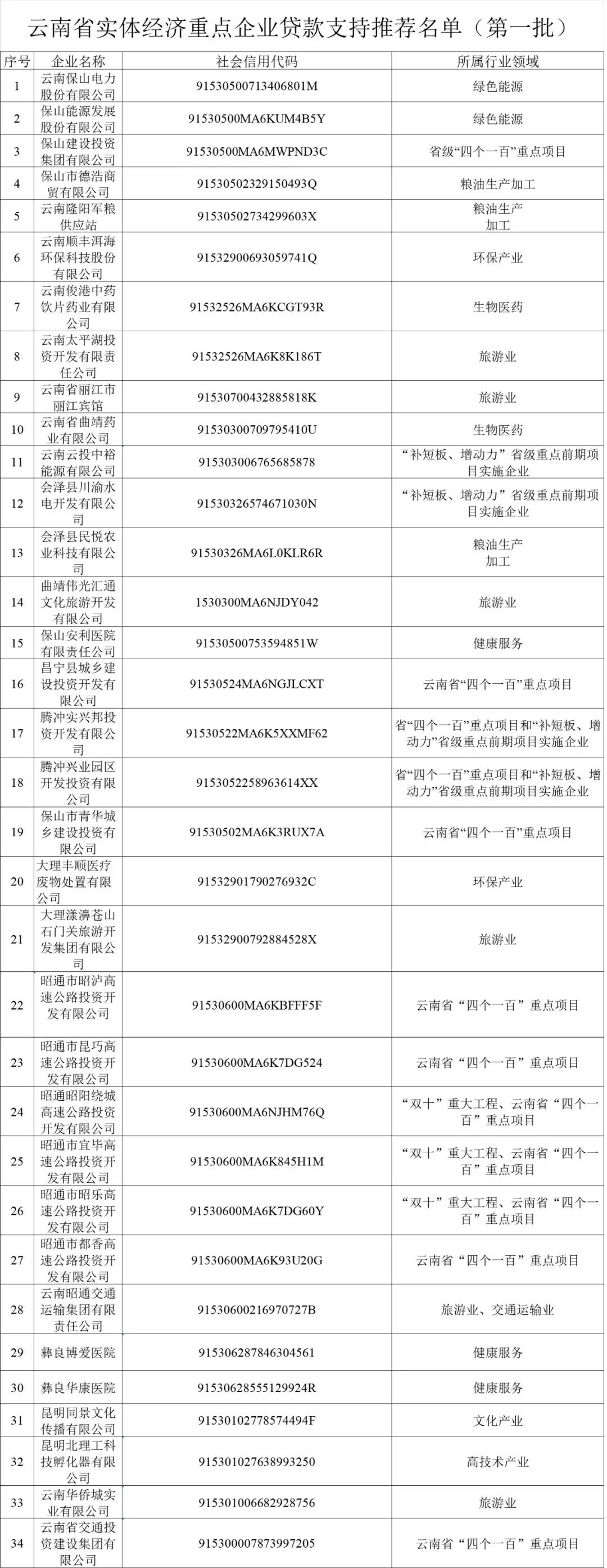根據(jù)《云南省人民政府印發(fā)關(guān)于支持實(shí)體經(jīng)濟(jì)發(fā)展的若干措施的通知》、《云南省發(fā)展和改革委員會(huì)關(guān)于貫徹落實(shí)支持實(shí)體經(jīng)濟(jì)發(fā)展的若干措施實(shí)行貸款企業(yè)名單制管理有關(guān)事項(xiàng)的通知》要求,現(xiàn)將省發(fā)展改革委推送至省工業(yè)和信息化廳、省財(cái)政廳、省農(nóng)業(yè)農(nóng)村廳、省商務(wù)廳、省文化和旅游廳、省地方金融監(jiān)管局、省稅務(wù)局、人民銀行昆明中心支行、云南銀保監(jiān)局、云南證監(jiān)局,以及抄送相關(guān)金融機(jī)構(gòu)的《云南省實(shí)體經(jīng)濟(jì)重點(diǎn)企業(yè)貸款支持推薦名單》(第一批)予以公布。