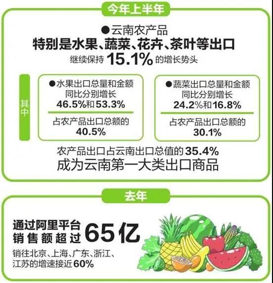 砥礪打造,一朝噴薄。今年上半年,在新冠肺炎疫情對全國進出口貿(mào)易帶來嚴重沖擊的大背景下,云南農(nóng)產(chǎn)品特別是水果、蔬菜、花卉、茶葉等多個品種出口逆市增長,繼續(xù)保持15.1%的增長勢頭。其中,水果出口總量和金額同比分別增長46.5%和53.3%,占農(nóng)產(chǎn)品出口總額的40.5%;蔬菜出口總量和金額同比分別增長24.2%和16.8%,占農(nóng)產(chǎn)品出口總額的30.1%。1月至6月,農(nóng)產(chǎn)品出口占云南出口總值的35.4%,成為云南第一大類出口商品。
