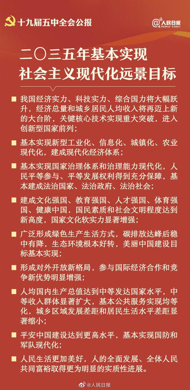10月29日,中國共產(chǎn)黨第十九屆中央委員會第五次全體會議公報發(fā)布。全會高度評價決勝全面建成小康社會取得的決定性成就,提出了到二〇三五年基本實現(xiàn)社會主義現(xiàn)代化遠(yuǎn)景目標(biāo)以及“十四五”時期經(jīng)濟(jì)社會發(fā)展主要目標(biāo)。中國將如何實現(xiàn)這一宏偉藍(lán)圖,14個關(guān)鍵詞速讀五中全會公報。