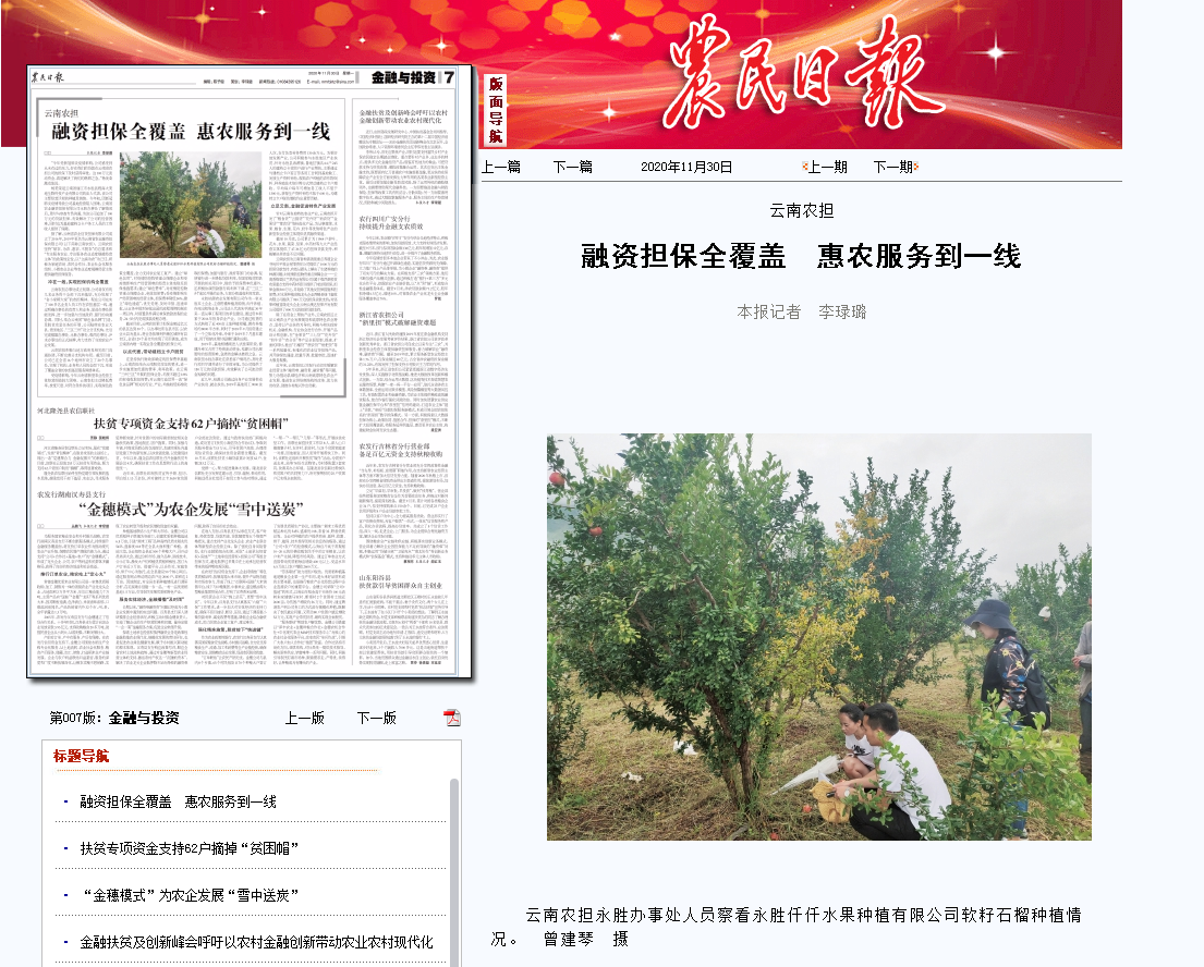 10月,國(guó)家農(nóng)擔(dān)公司微信公眾號(hào)“農(nóng)擔(dān)經(jīng)驗(yàn)談”專欄中對(duì)云南農(nóng)擔(dān)公司認(rèn)真貫徹落實(shí)云南省脫貧攻堅(jiān)等扶貧政策,支持麗江永勝縣農(nóng)業(yè)生產(chǎn)、帶動(dòng)貧困戶脫貧增收,積極為當(dāng)?shù)匦滦娃r(nóng)業(yè)經(jīng)營(yíng)主體提供融資擔(dān)保服務(wù)進(jìn)行了宣傳。《農(nóng)民日?qǐng)?bào)》從國(guó)家農(nóng)擔(dān)公司了解到云南農(nóng)擔(dān)支農(nóng)惠農(nóng)的相關(guān)情況后,11月30日以《融資擔(dān)保全覆蓋 惠農(nóng)服務(wù)到一線》為題報(bào)道了云南農(nóng)擔(dān)公司成立以來(lái),不斷完善分支機(jī)構(gòu)布局,實(shí)現(xiàn)了機(jī)構(gòu)、業(yè)務(wù)和人員的全面下沉,形成了覆蓋全省的農(nóng)擔(dān)基層服務(wù)網(wǎng)絡(luò)體系,以點(diǎn)帶面、立足當(dāng)?shù)?,為推?dòng)縣域經(jīng)濟(jì)和云南高原特色農(nóng)業(yè)產(chǎn)業(yè)發(fā)展、推進(jìn)農(nóng)業(yè)供給側(cè)結(jié)構(gòu)性改革、助力脫貧攻堅(jiān)、助推“鄉(xiāng)村振興”戰(zhàn)略實(shí)施發(fā)揮了積極作用。