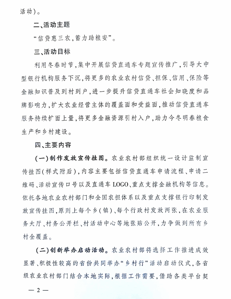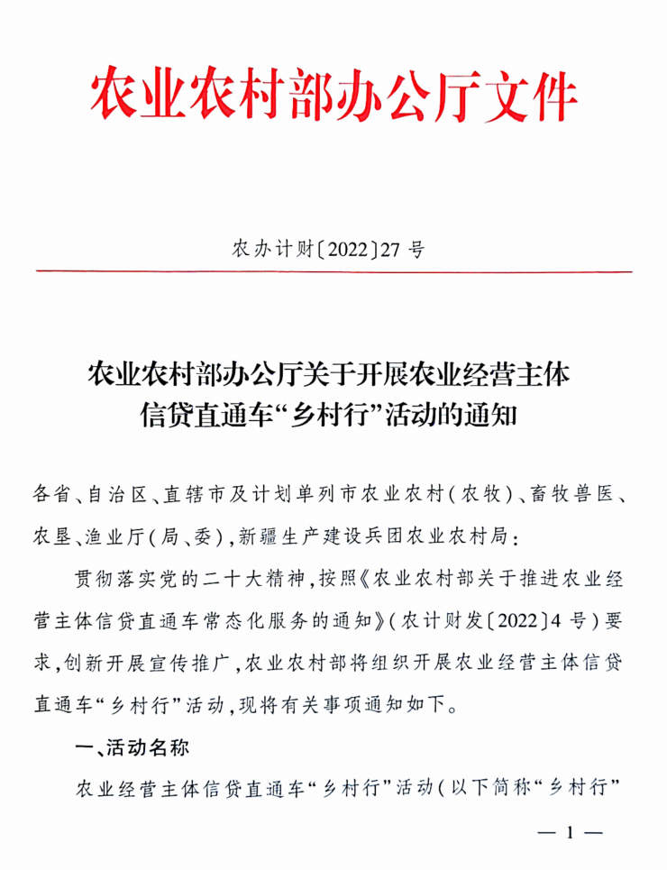 農(nóng)業(yè)農(nóng)村部印發(fā)通知開展農(nóng)業(yè)經(jīng)營主體信貸直通車“鄉(xiāng)村行”活動(dòng)