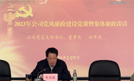 2月9日,云南省農(nóng)業(yè)融資擔(dān)保有限公黨總支部書記、董事長(zhǎng)杜開波在公司年度工作會(huì)議上,為全體職工上了一堂黨風(fēng)廉政建設(shè)專題黨課,并作集體廉政談話。省公司全體職工、州市分支機(jī)構(gòu)負(fù)責(zé)人、主管等現(xiàn)場(chǎng)聽課,各州市分支機(jī)構(gòu)全員通過視頻方式聽課。