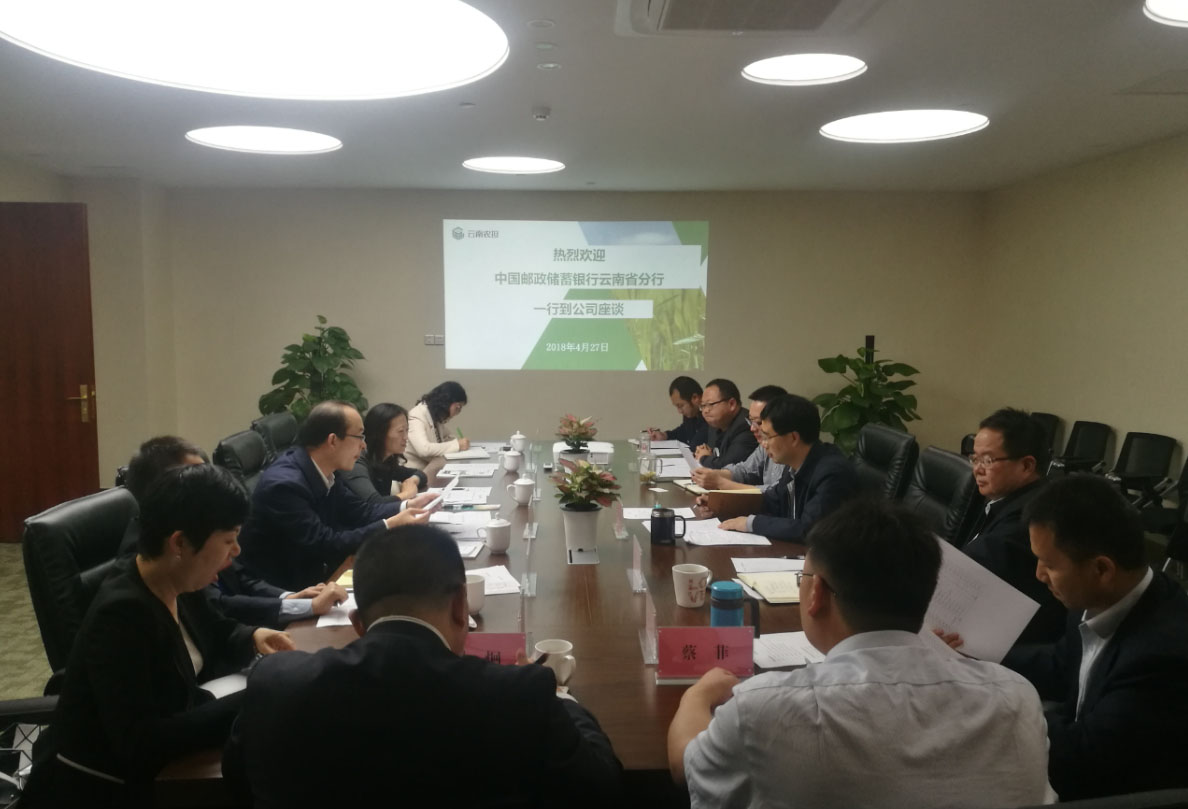 2018年4月27日,中國(guó)郵政儲(chǔ)蓄銀行云南省分行孟浩副行長(zhǎng)一行到省農(nóng)擔(dān)公司座談,公司郭影董事長(zhǎng)、杜開(kāi)波總經(jīng)理、廖寅皓副總經(jīng)理及各部門負(fù)責(zé)人出席會(huì)議,雙方就下一步展開(kāi)深度合作展開(kāi)座談。