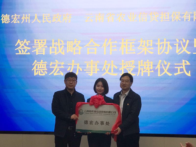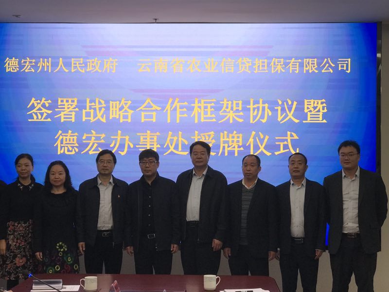 12月19日上午,德宏州人民政府、云南農(nóng)擔(dān)公司簽署戰(zhàn)略合作框架協(xié)議暨德宏辦事處授牌儀式在芒市會堂舉行。德宏州委常委、常務(wù)副州長馬云峰,農(nóng)擔(dān)公司董事長郭影、總經(jīng)理杜開波、機(jī)構(gòu)部負(fù)責(zé)人蔡菲、德宏州財(cái)政局、農(nóng)業(yè)局、人行德宏支行、德宏銀監(jiān)分局、農(nóng)行德宏分行、省聯(lián)社德宏辦、各縣市政府等相關(guān)單位參加會議。