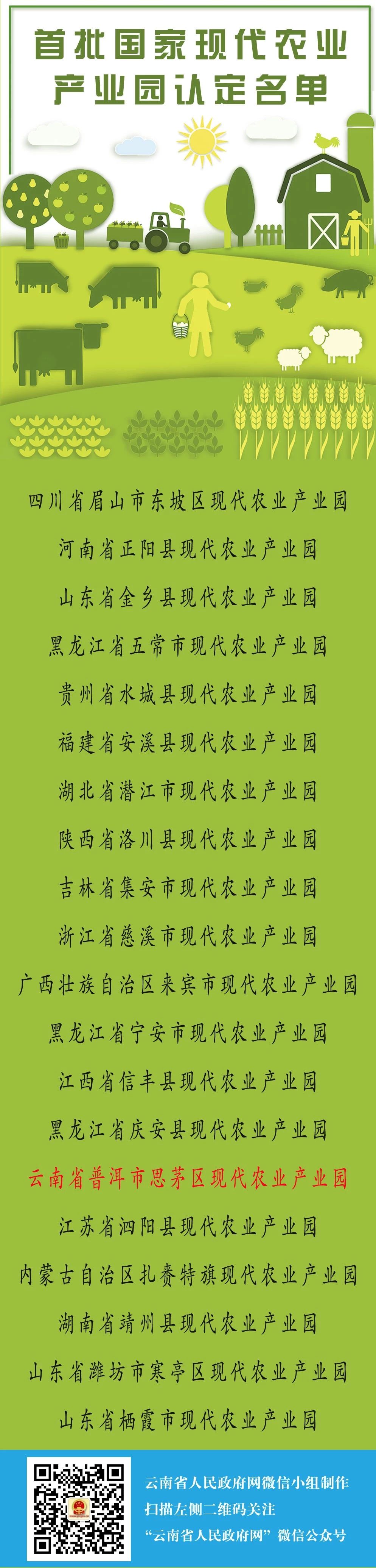 在2018年12月30日召開的全國農(nóng)業(yè)農(nóng)村廳局長會(huì)議上,農(nóng)業(yè)農(nóng)村部、財(cái)政部公布:經(jīng)自評申請、省級推薦、績效評價(jià)和現(xiàn)場考察等程序,四川省眉山市東坡區(qū)等20個(gè)現(xiàn)代農(nóng)業(yè)產(chǎn)業(yè)園被認(rèn)定為首批國家現(xiàn)代農(nóng)業(yè)產(chǎn)業(yè)園,其中云南省普洱市思茅區(qū)現(xiàn)代農(nóng)業(yè)產(chǎn)業(yè)園入選。