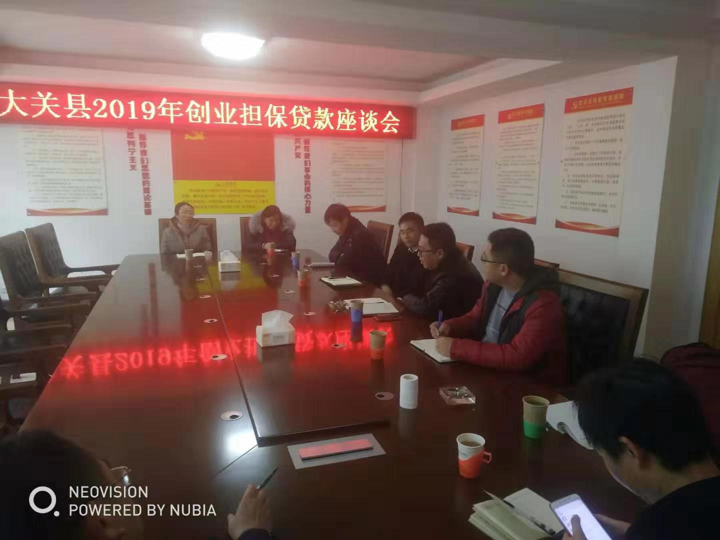 2月19日,昭通辦事處負(fù)責(zé)人朱磊攜辦事處人員到中國農(nóng)業(yè)銀行大關(guān)縣支行與大關(guān)縣勞動就業(yè)局局長鄧飛、大關(guān)縣財(cái)政局涉外科陳清華、農(nóng)業(yè)銀行大關(guān)縣支行行長袁龍強(qiáng)圍繞農(nóng)擔(dān)與政府協(xié)議開展座談。