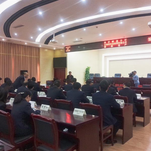 辦事處與昭通農(nóng)業(yè)銀行分行領(lǐng)導、各縣行長、信貸經(jīng)理及分行各部門在農(nóng)業(yè)銀行分行共同就前期審核通過借款客戶批量舉辦簽約儀式